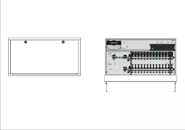 strawa Comfort Anschlussstation FBH-63-H-W1-WMZ-C80-E 14 Hkr.,BxHxT: 1200x775x92 mm, horiz. AG. m. WMZ, Verteiler m. DFA 0-3 l/min + THV M30x1,5, vorm. Stellantr. u. Klemml. m. Vorverdraht., Wasserzählerstr. TW kalt, CUP-Schrank m. Frontbl. in RAL 9016