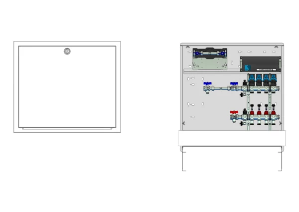 strawa Comfort Anschlussstation FBH-18-H-W1-WMZ-C80-EGO 4 Hkr.,BxHxT: 748x775x92 mm, horiz. AG. m. WMZ, Verteiler m. DFA min/max + THV, m. vorm. EGO-Regelantr. u. Klemml. m. Vorverdr., Wasserzählerstr. TW kalt, CUP-Schrank m. Frontbl. in RAL 9016