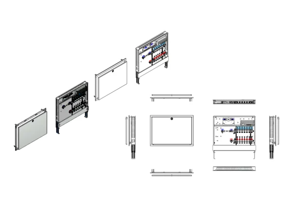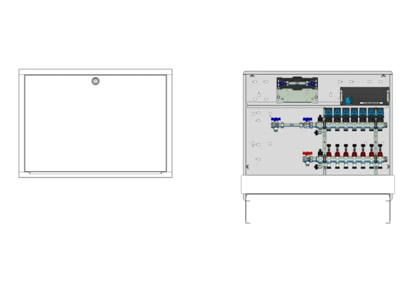Anschlussstation für Flächenheizung, im Unterputz-Schrank montierter Edelstahlverteiler mit absperrbaren Durchflussanzeigern und Ventileinsätzen für EGO-Schnellverschluss, horizontale Anschlussgarnitur mit Wärmezählerverrohrung, Wasserzählereinbaustrecke für Trinkwasser kalt, vormontierte und vorverdrahtete EGO-Regelantriebe auf vormontierter Klemmleiste.