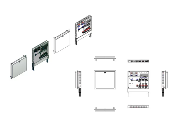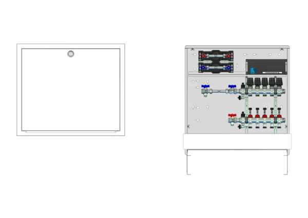 horizontale Anschlussgarnitur mit Wärmezählerverohrung, Verteiler mit Durchflussanzeiger 0-3 l/min im Vorlaufbalken und Thermostatventileinsatz M30x1,5 im Rücklaufbalken, vormontierte Stellantriebe und Klemmleiste mit Vorverdrahtung, Wasserzählerstrecken Trinkwasser kalt und warm, Comfort-Unterputz-Schrank mit Frontblende in RAL 9016