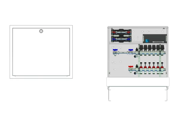 horizontale Anschlussgarnitur mit Wärmezählerverohrung, Verteiler mit Durchflussanzeiger 0-3 l/min im Vorlaufbalken und Thermostatventileinsatz M30x1,5 im Rücklaufbalken, vormontierte Stellantriebe und Klemmleiste mit Vorverdrahtung, Wasserzählerstrecken Trinkwasser kalt und warm, Comfort-Unterputz-Schrank mit Frontblende in RAL 9016