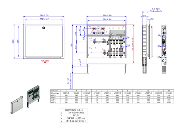 horizontale Anschlussgarnitur mit Wärmezählerverohrung, Verteiler mit Durchflussanzeiger 0-3 l/min im Vorlaufbalken und Thermostatventileinsatz M30x1,5 im Rücklaufbalken, vormontierte Stellantriebe und Klemmleiste mit Vorverdrahtung, Wasserzählerstrecken Trinkwasser kalt und warm, Comfort-Unterputz-Schrank mit Frontblende in RAL 9016