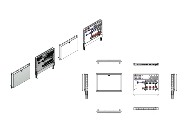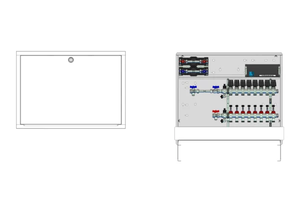 horizontale Anschlussgarnitur mit Wärmezählerverohrung, Verteiler mit Durchflussanzeiger 0-3 l/min im Vorlaufbalken und Thermostatventileinsatz M30x1,5 im Rücklaufbalken, vormontierte Stellantriebe und Klemmleiste mit Vorverdrahtung, Wasserzählerstrecken Trinkwasser kalt und warm, Comfort-Unterputz-Schrank mit Frontblende in RAL 9016