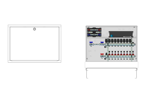horizontale Anschlussgarnitur mit Wärmezählerverohrung, Verteiler mit Durchflussanzeiger 0-3 l/min im Vorlaufbalken und Thermostatventileinsatz M30x1,5 im Rücklaufbalken, vormontierte Stellantriebe und Klemmleiste mit Vorverdrahtung, Wasserzählerstrecken Trinkwasser kalt und warm, Comfort-Unterputz-Schrank mit Frontblende in RAL 9016