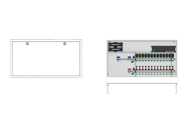 horizontale Anschlussgarnitur mit Wärmezählerverohrung, Verteiler mit Durchflussanzeiger 0-3 l/min im Vorlaufbalken und Thermostatventileinsatz M30x1,5 im Rücklaufbalken, vormontierte Stellantriebe und Klemmleiste mit Vorverdrahtung, Wasserzählerstrecken Trinkwasser kalt und warm, Comfort-Unterputz-Schrank mit Frontblende in RAL 9016