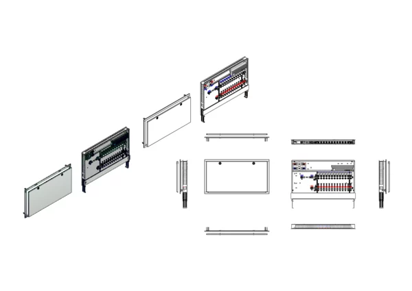 Anschlussstation für Flächenheizung, im Unterputzschrank montierter Edelstahlverteiler mit regulierbaren Durchflussanzeigern und Ventileinsätzen (M30x1,5), horizontale Anschlussgarnitur mit Wärmezählerverrohrung, Wasserzählereinbaustrecke für Trinkwasser kalt und warm, vormontierte und verdrahtete Stellantriebe auf montierter Klemmleiste.