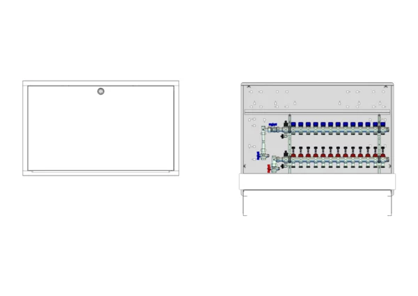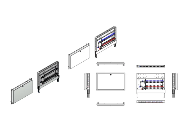 Anschlussstation für Flächenheizung und -kühlung, im Unterputzschrank montierter Edelstahlverteiler mit regulierbaren Durchflussanzeigern und Ventileinsätzen (M30x1,5), vertikale Anschlussgarnitur mit Wärmezählerverrohrung, Platzhaltung für Wasserzählereinbaustrecke, Klemmleiste und Stellantriebe.