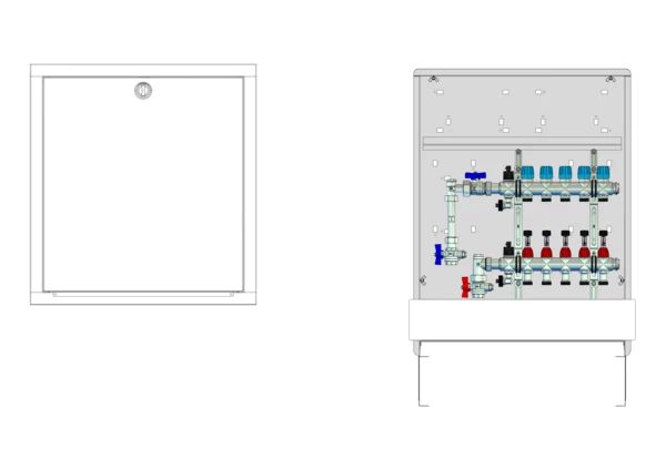 strawa Comfort Anschlussstation FBH-18-V-WMZ-C80 5 Hkr.,BxHxT: 600x775x92 mm, vert. AG. m. WMZ, Verteiler mit DFA min/max + THV für EGO-Aufnahme, Comfort-UP-Schrank mit Frontblende in RAL 9016