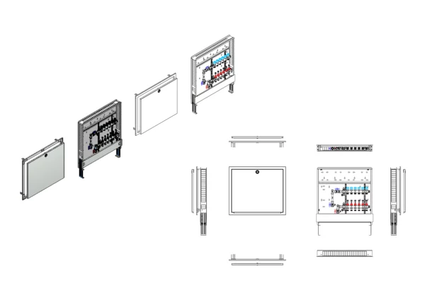 Anschlussstation für Flächenheizung und -kühlung, im Unterputzschrank montierter Edelstahlverteiler mit absperrbarem Durchflussanzeigern und Ventileinsätzen für EGO-Schnellverschluss, vertikale Anschlussgarnitur mit Wärmezählerverrohrung, Platzhaltung für Wasserzählereinbaustrecke, Klemmleiste und EGO-Regelantriebe .