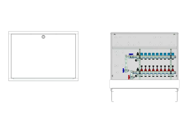 strawa Comfort Anschlussstation FBH-18-V-WMZ-C80 9 Hkr.,BxHxT: 900 x 775 x 92 mm, vert. AG. m. WMZ, Verteiler mit DFA min/max + THV für EGO-Aufnahme, Comfort-UP-Schrank mit Frontblende in RAL 9016