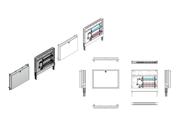Anschlussstation für Flächenheizung und -kühlung, im Unterputzschrank montierter Edelstahlverteiler mit absperrbarem Durchflussanzeigern und Ventileinsätzen für EGO-Schnellverschluss, vertikale Anschlussgarnitur mit Wärmezählerverrohrung, Platzhaltung für Wasserzählereinbaustrecke, Klemmleiste und EGO-Regelantriebe .