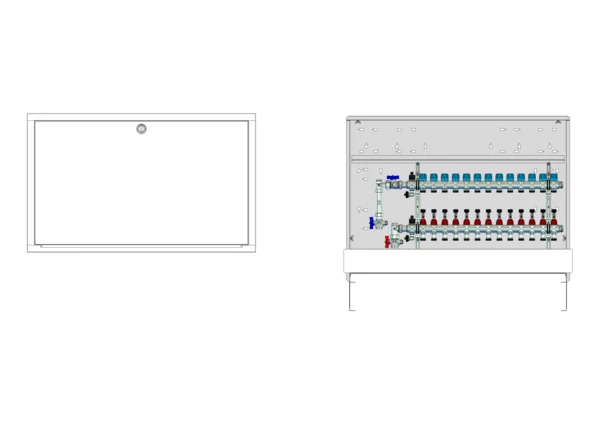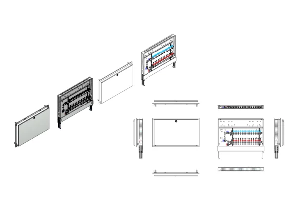 Anschlussstation für Flächenheizung und -kühlung, im Unterputzschrank montierter Edelstahlverteiler mit absperrbarem Durchflussanzeigern und Ventileinsätzen für EGO-Schnellverschluss, vertikale Anschlussgarnitur mit Wärmezählerverrohrung, Platzhaltung für Wasserzählereinbaustrecke, Klemmleiste und EGO-Regelantriebe .