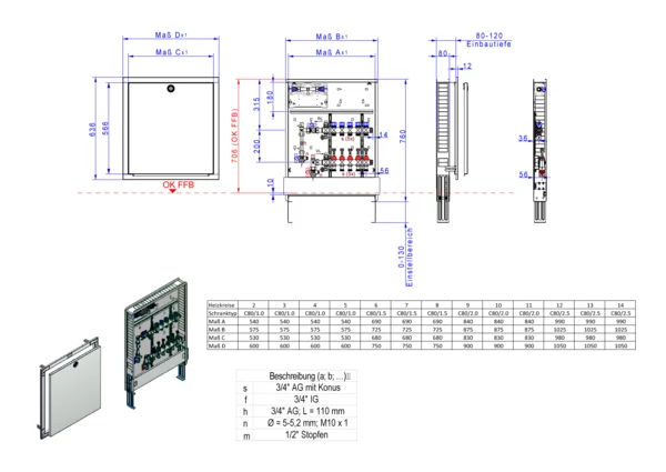 Anschlussstation für Flächenheizung und -kühlung, im Unterputzschrank montierter Edelstahlverteiler mit regulierbaren Durchflussanzeigern und Ventileinsätzen (M30x1,5), vertikale Anschlussgarnitur mit Wärmezählerverrohrung, Wasserzählereinbaustrecke für Trinkwasser kalt, Platzhaltung für Klemmleiste und Stellantriebe.