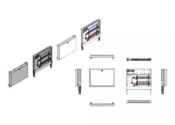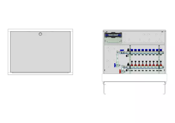 strawa Comfort Anschlussstation FBH-63-V-W1-WMZ-C80 9 Hkr.,BxHxT: 900x775x92 mm, vert. AG. m. WMZ, Verteiler m. DFA 0-3 l/min + THV M30x1,5, Wasserzählerstr. TW kalt, CUP-Schrank m. Frontbl. in RAL 9016