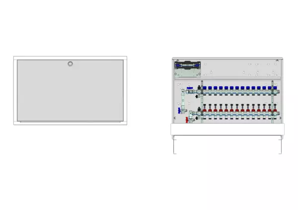 strawa Comfort Anschlussstation FBH-63-V-W1-WMZ-C80 14 Hkr.,BxHxT: 1050x775x92 mm, vert. AG. m. WMZ, Verteiler m. DFA 0-3 l/min + THV M30x1,5, Wasserzählerstr. TW kalt, CUP-Schrank m. Frontbl. in RAL 9016