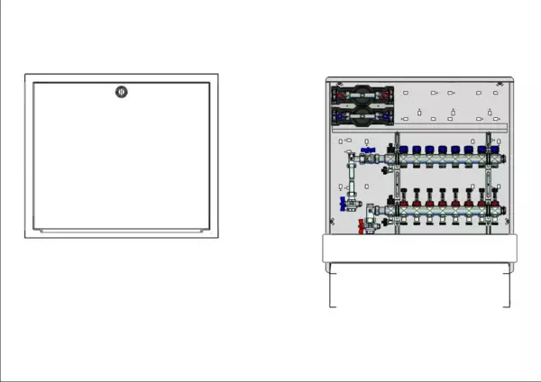 strawa Comfort Anschlussstation FBH-63-V-W2-WMZ-C80 8 Hkr.,BxHxT: 750x775x92 mm, vert. AG. m. WMZ, Verteiler m. DFA 0-3 l/min + THV M30x1,5, Wasserzählerstr. TW kalt u. warm, CUP-Schrank m. Frontbl. in RAL 9016