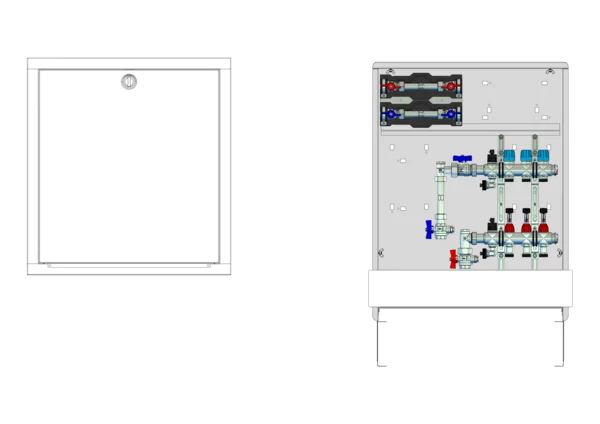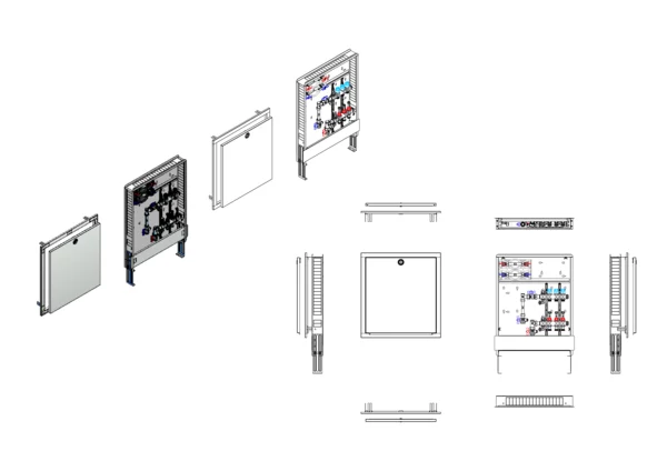 Anschlussstation für Flächenheizung und -kühlung, im Unterputzschrank montierter Edelstahlverteiler mit absperrbarem Durchflussanzeigern und Ventileinsätzen für EGO-Schnellverschluss, vertikale Anschlussgarnitur mit Wärmezählerverrohrung, Wasserzählereinbaustrecke für Trinkwasser kalt und warm, Platzhaltung für Klemmleiste und EGO-Regelantriebe.