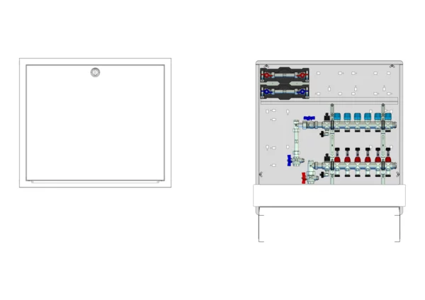 strawa Comfort Anschlussstation FBH-18-V-W2-WMZ-C80 6 Hkr.,BxHxT: 750x775x92 mm, vert. AG. m. WMZ, Verteiler mit DFA min/max + THV für EGO-Aufnahme, Wasserzählerstr. TW kalt u. warm, Comfort-UP-Schrank mit Frontblende in RAL 9016