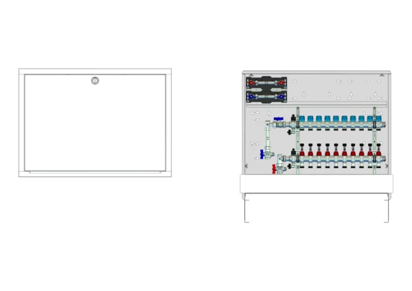 strawa Comfort Anschlussstation FBH-18-V-W2-WMZ-C80 10 Hkr.,BxHxT: 900 x 775 x 92 mm, vert. AG. m. WMZ, Verteiler mit DFA min/max + THV für EGO-Aufnahme, Wasserzählerstr. TW kalt u. warm, Comfort-UP-Schrank mit Frontblende in RAL 9016