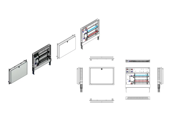 Anschlussstation für Flächenheizung und -kühlung, im Unterputzschrank montierter Edelstahlverteiler mit absperrbarem Durchflussanzeigern und Ventileinsätzen für EGO-Schnellverschluss, vertikale Anschlussgarnitur mit Wärmezählerverrohrung, Wasserzählereinbaustrecke für Trinkwasser kalt und warm, Platzhaltung für Klemmleiste und EGO-Regelantriebe.