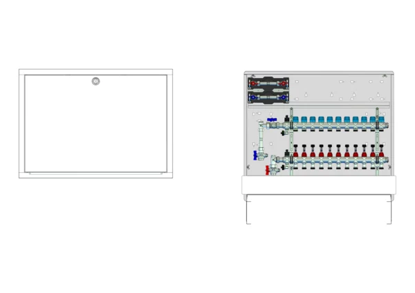 strawa Comfort Anschlussstation FBH-18-V-W2-WMZ-C80 11 Hkr.,BxHxT: 900 x 775 x 92 mm, vert. AG. m. WMZ, Verteiler mit DFA min/max + THV für EGO-Aufnahme, Wasserzählerstr. TW kalt u. warm, Comfort-UP-Schrank mit Frontblende in RAL 9016