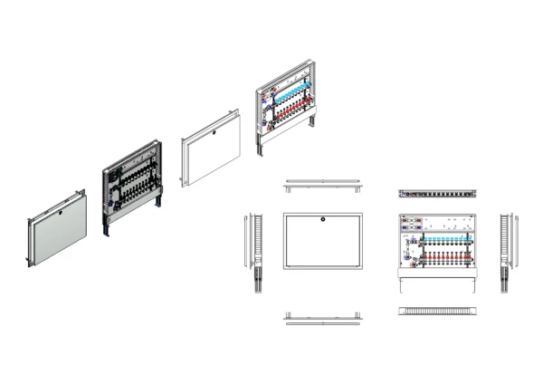 Anschlussstation für Flächenheizung und -kühlung, im Unterputzschrank montierter Edelstahlverteiler mit absperrbarem Durchflussanzeigern und Ventileinsätzen für EGO-Schnellverschluss, vertikale Anschlussgarnitur mit Wärmezählerverrohrung, Wasserzählereinbaustrecke für Trinkwasser kalt und warm, Platzhaltung für Klemmleiste und EGO-Regelantriebe.