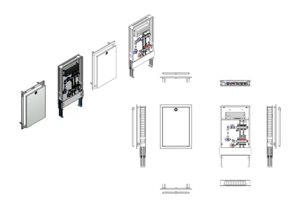 vertikale Anschlussgarnitur mit Wärmezählerverohrung, Verteiler mit Durchflussanzeiger 0-3 l/min im Vorlaufbalken und Thermostatventileinsatz M30x1,5 im Rücklaufbalken, vormontierte Stellantriebe und Klemmleiste mit Vorverdrahtung, Comfort-Unterputz-Schrank mit Frontblende in RAL 9016