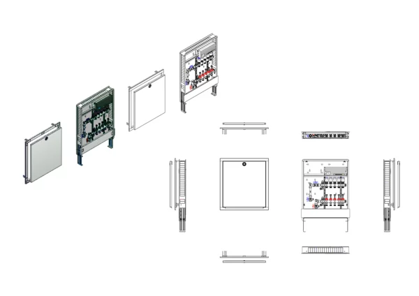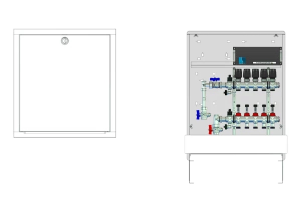 strawa Comfort Anschlussstation FBH-63-V-WMZ-C80-E 5 Hkr.,BxHxT: 600x775x92 mm, vert. AG. m. WMZ, Verteiler mit DFA 0-3 l/min + THV M30x1,5, vorm. Stellantr.+Klemml. m. Vorverdraht., Comfort-UP-Schrank mit Frontblende in RAL 9016