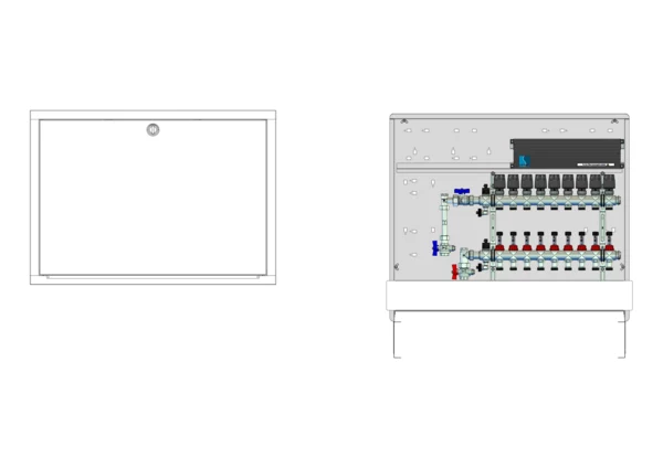 strawa Comfort Anschlussstation FBH-63-V-WMZ-C80-E 9 Hkr.,BxHxT: 900x775x92 mm, vert. AG. m. WMZ, Verteiler mit DFA 0-3 l/min + THV M30x1,5, vorm. Stellantr.+Klemml. m. Vorverdraht., Comfort-UP-Schrank mit Frontblende in RAL 9016