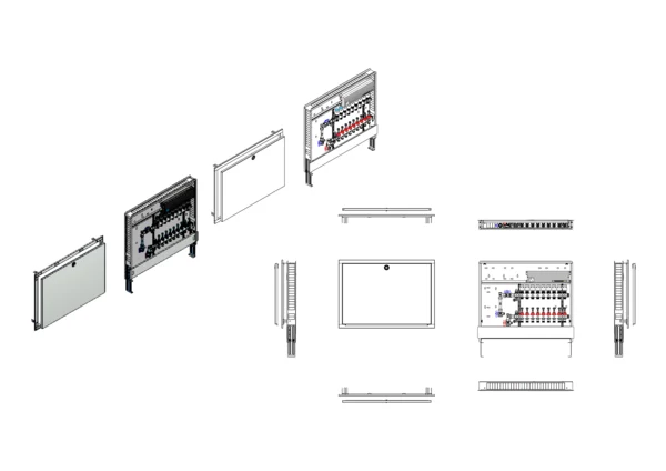 vertikale Anschlussgarnitur mit Wärmezählerverohrung, Verteiler mit Durchflussanzeiger 0-3 l/min im Vorlaufbalken und Thermostatventileinsatz M30x1,5 im Rücklaufbalken, vormontierte Stellantriebe und Klemmleiste mit Vorverdrahtung, Comfort-Unterputz-Schrank mit Frontblende in RAL 9016