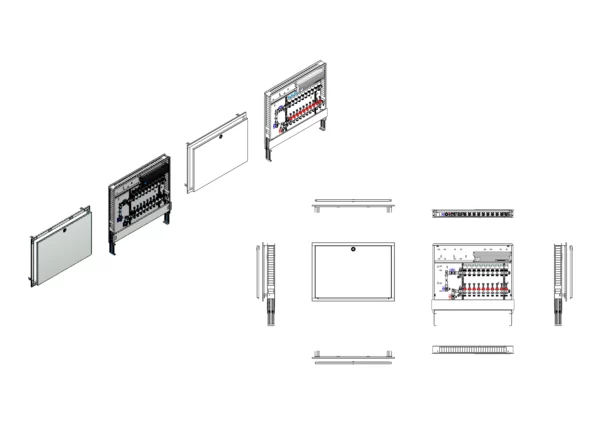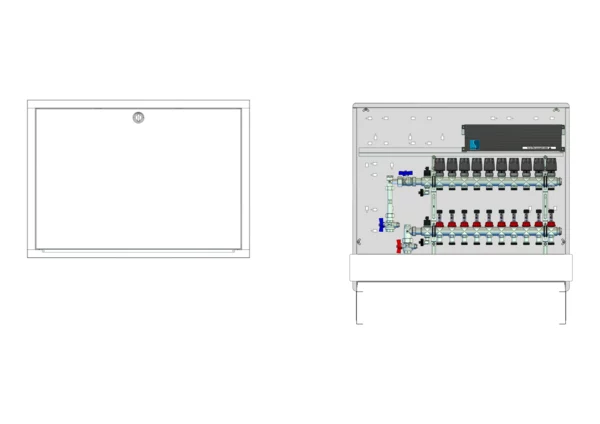 vertikale Anschlussgarnitur mit Wärmezählerverohrung, Verteiler mit Durchflussanzeiger 0-3 l/min im Vorlaufbalken und Thermostatventileinsatz M30x1,5 im Rücklaufbalken, vormontierte Stellantriebe und Klemmleiste mit Vorverdrahtung, Comfort-Unterputz-Schrank mit Frontblende in RAL 9016
