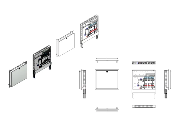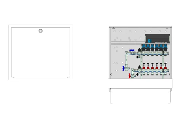 Anschlussstation für Flächenheizung, im Unterputzschrank montierter Edelstahlverteiler mit absperrbarem Durchflussanzeigern und Ventileinsätzen für EGO-Schnellverschluss, vertikale Anschlussgarnitur mit Wärmezählerverrohrung, vormontierte und vorverdrahtete EGO-Regelantriebe auf vormontierter Klemmleiste, Platzhaltung für Wasserzählereinbaustrecke.
