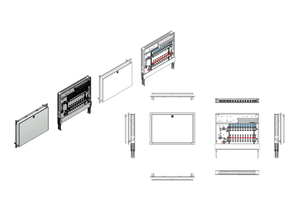 Anschlussstation für Flächenheizung, im Unterputzschrank montierter Edelstahlverteiler mit absperrbarem Durchflussanzeigern und Ventileinsätzen für EGO-Schnellverschluss, vertikale Anschlussgarnitur mit Wärmezählerverrohrung, vormontierte und vorverdrahtete EGO-Regelantriebe auf vormontierter Klemmleiste, Platzhaltung für Wasserzählereinbaustrecke.