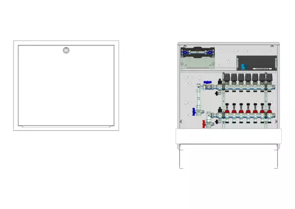 vertikale Anschlussgarnitur mit Wärmezählerverohrung, Verteiler mit Durchflussanzeiger 0-3 l/min im Vorlaufbalken und Thermostatventileinsatz M30x1,5 im Rücklaufbalken, vormontierte Stellantriebe und Klemmleiste mit Vorverdrahtung, Wasserzählerstrecke Trinkwasser kalt, Comfort-Unterputz-Schrank mit Frontblende in RAL 9016