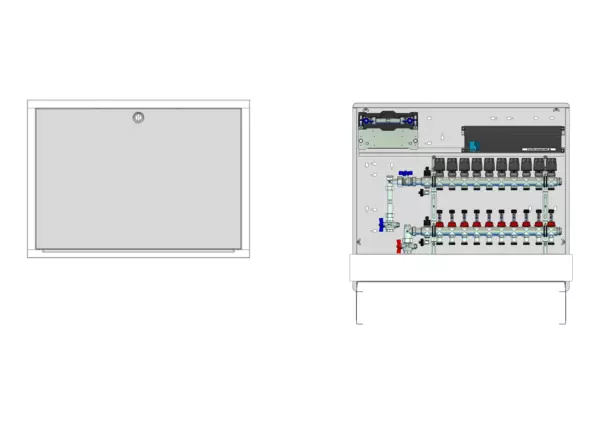 vertikale Anschlussgarnitur mit Wärmezählerverohrung, Verteiler mit Durchflussanzeiger 0-3 l/min im Vorlaufbalken und Thermostatventileinsatz M30x1,5 im Rücklaufbalken, vormontierte Stellantriebe und Klemmleiste mit Vorverdrahtung, Wasserzählerstrecke Trinkwasser kalt, Comfort-Unterputz-Schrank mit Frontblende in RAL 9016