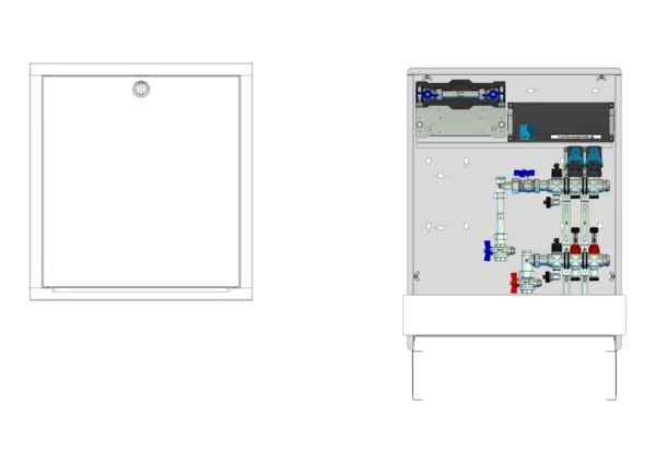 strawa Comfort Anschlussstation FBH-18-V-W1-WMZ-C80-EGO 2 Hkr.,BxHxT: 600x775x92 mm, vert. AG. m. WMZ, Verteiler mit DFA min/max + THV, mit vorm. EGO-Regelantr. u. Klemml. mit Vorverdr., Wasserzählerstr. TW kalt, CUP-Schrank m. Frontblende RAL 9016
