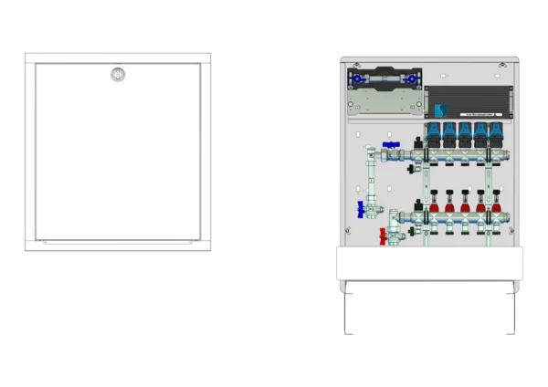 strawa Comfort Anschlussstation FBH-18-V-W1-WMZ-C80-EGO 5 Hkr.,BxHxT: 600 x 775 x 92 mm, vert. AG. m. WMZ, Verteiler mit DFA min/max + THV, mit vorm. EGO-Regelantr. u. Klemml. mit Vorverdr., Wasserzählerstr. TW kalt, CUP-Schrank m. Frontblende RAL 9016