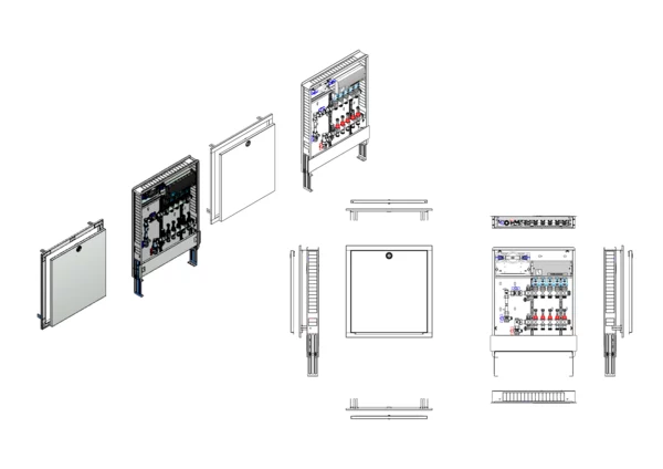 Anschlussstation für Flächenheizung, im Unterputzschrank montierter Edelstahlverteiler mit absperrbarem Durchflussanzeigern und Ventileinsätzen für EGO-Schnellverschluss, vertikale Anschlussgarnitur mit Wärmezählerverrohrung, Wasserzählereinbaustrecke für Trinkwasser kalt, vormontierte und vorverdrahtete EGO-Regelantriebe auf vormontierter Klemmleiste.