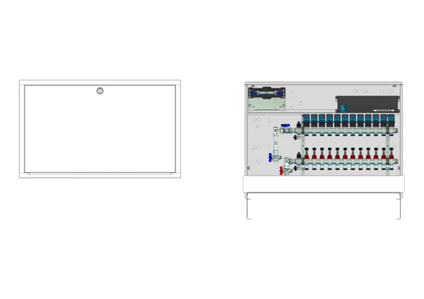 strawa Comfort Anschlussstation FBH-18-V-W1-WMZ-C80-EGO 12 Hkr.,BxHxT: 1050 x 775 x 92 mm, vert. AG. m. WMZ, Verteiler mit DFA min/max + THV, mit vorm. EGO-Regelantr. u. Klemml. mit Vorverdr., Wasserzählerstr. TW kalt, CUP-Schrank m. Frontblende RAL 9016