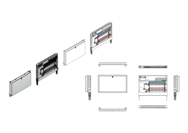 Anschlussstation für Flächenheizung, im Unterputzschrank montierter Edelstahlverteiler mit absperrbarem Durchflussanzeigern und Ventileinsätzen für EGO-Schnellverschluss, vertikale Anschlussgarnitur mit Wärmezählerverrohrung, Wasserzählereinbaustrecke für Trinkwasser kalt, vormontierte und vorverdrahtete EGO-Regelantriebe auf vormontierter Klemmleiste.