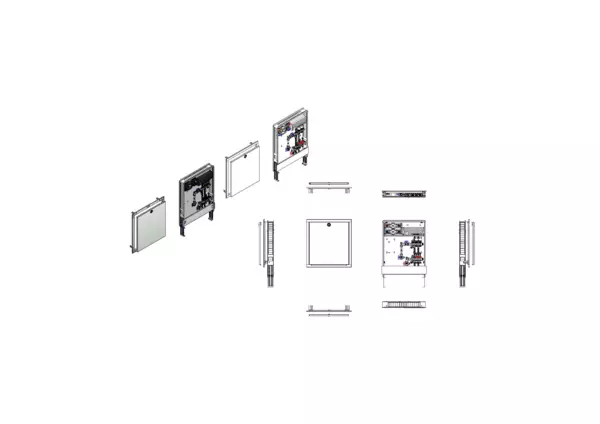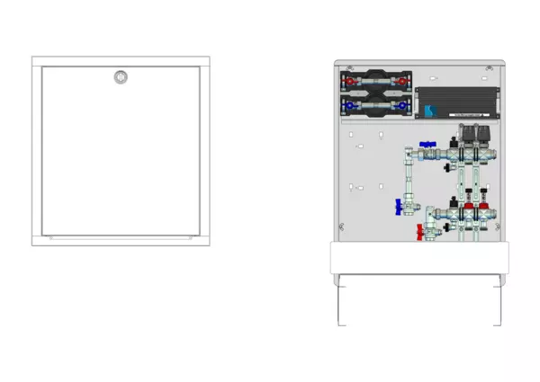 vertikale Anschlussgarnitur mit Wärmezählerverohrung, Verteiler mit Durchflussanzeiger 0-3 l/min im Vorlaufbalken und Thermostatventileinsatz M30x1,5 im Rücklaufbalken, vormontierte Stellantriebe und Klemmleiste mit Vorverdrahtung, Wasserzählerstrecken Trinkwasser kalt und warm, Comfort-Unterputz-Schrank mit Frontblende RAL 9016