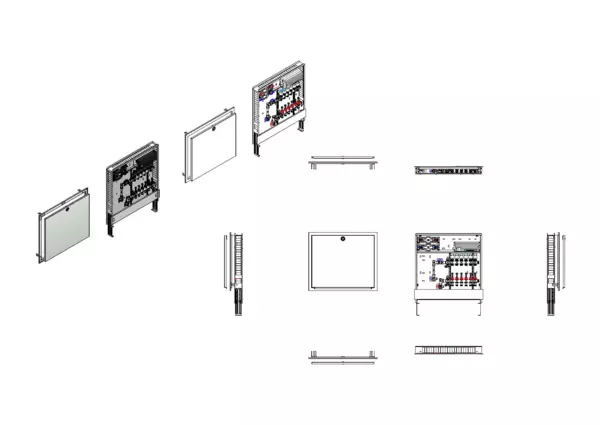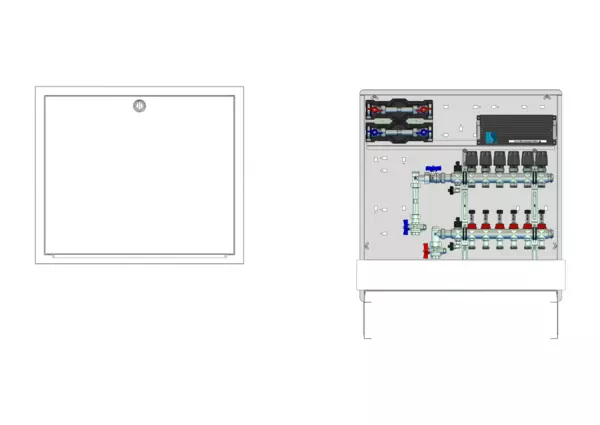 vertikale Anschlussgarnitur mit Wärmezählerverohrung, Verteiler mit Durchflussanzeiger 0-3 l/min im Vorlaufbalken und Thermostatventileinsatz M30x1,5 im Rücklaufbalken, vormontierte Stellantriebe und Klemmleiste mit Vorverdrahtung, Wasserzählerstrecken Trinkwasser kalt und warm, Comfort-Unterputz-Schrank mit Frontblende RAL 9016