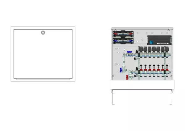 vertikale Anschlussgarnitur mit Wärmezählerverohrung, Verteiler mit Durchflussanzeiger 0-3 l/min im Vorlaufbalken und Thermostatventileinsatz M30x1,5 im Rücklaufbalken, vormontierte Stellantriebe und Klemmleiste mit Vorverdrahtung, Wasserzählerstrecken Trinkwasser kalt und warm, Comfort-Unterputz-Schrank mit Frontblende RAL 9016
