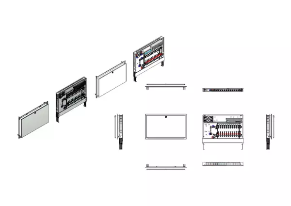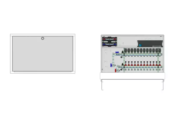 vertikale Anschlussgarnitur mit Wärmezählerverohrung, Verteiler mit Durchflussanzeiger 0-3 l/min im Vorlaufbalken und Thermostatventileinsatz M30x1,5 im Rücklaufbalken, vormontierte Stellantriebe und Klemmleiste mit Vorverdrahtung, Wasserzählerstrecken Trinkwasser kalt und warm, Comfort-Unterputz-Schrank mit Frontblende RAL 9016