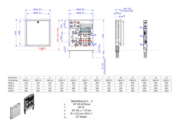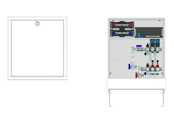 strawa Comfort Anschlussstation FBH-18-V-W2-WMZ-C80-EGO 2 Hkr.,BxHxT: 600 x 775 x 92 mm, vert. AG. m. WMZ, Verteiler mit DFA min/max+THV, m. vorm. EGO-Regelantr. u. Klemml. mit Vorverdr., Wasserzählerstr. TW kalt u. warm, CUP-Schrank m. Frontbl. RAL 9016