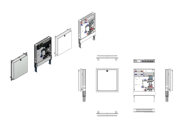 Anschlussstation für Flächenheizung, im Unterputzschrank montierter Edelstahlverteiler mit absperrbarem Durchflussanzeigern und Ventileinsätzen für EGO-Schnellverschluss, vertikale Anschlussgarnitur mit Wärmezählerverrohrung, Wasserzählereinbaustrecke für Trinkwasser kalt und warm, vormontierte und vorverdrahtete EGO-Regelantriebe auf vormontierter Klemmleiste.