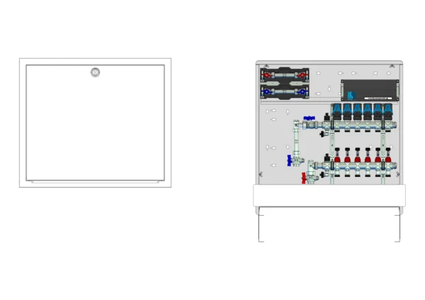 Anschlussstation für Flächenheizung, im Unterputzschrank montierter Edelstahlverteiler mit absperrbarem Durchflussanzeigern und Ventileinsätzen für EGO-Schnellverschluss, vertikale Anschlussgarnitur mit Wärmezählerverrohrung, Wasserzählereinbaustrecke für Trinkwasser kalt und warm, vormontierte und vorverdrahtete EGO-Regelantriebe auf vormontierter Klemmleiste.