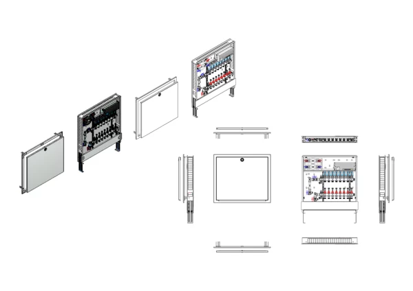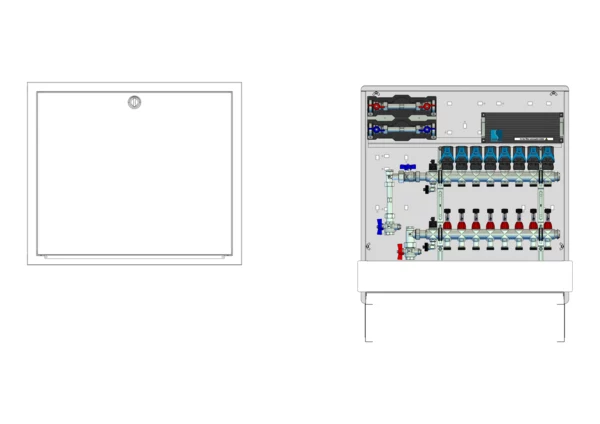 Anschlussstation für Flächenheizung, im Unterputzschrank montierter Edelstahlverteiler mit absperrbarem Durchflussanzeigern und Ventileinsätzen für EGO-Schnellverschluss, vertikale Anschlussgarnitur mit Wärmezählerverrohrung, Wasserzählereinbaustrecke für Trinkwasser kalt und warm, vormontierte und vorverdrahtete EGO-Regelantriebe auf vormontierter Klemmleiste.