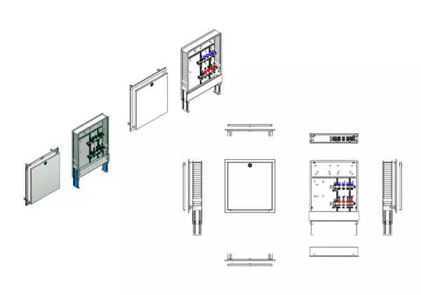 Modulare Anschlussstation für Flächenheizung und -kühlung, im Unterputzschrank montierter Edelstahlverteiler mit regulierbaren Durchflussanzeigern und Ventileinsätzen (M30x1,5), horizontale Anschlussgarnitur ohne Wärmezählerverrohrung, Platzhaltung für Anschlussgarnituren mit oder ohne Wärmezählerverrohrung, Wasserzählereinbaustrecken, Klemmleiste und Stellantriebe.