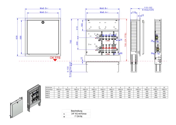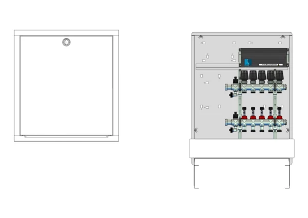 strawa Comfort Anschlussstation FBH-63-X-C69 5 Hkr.,BxHxT: 600 x 775 x 122 mm, ohne Anschlussgarnitur, Verteiler mit DFA 0-3 l/min + THV M30x1,5, Comfort-UP-Schrank mit Frontblende in RAL 9016